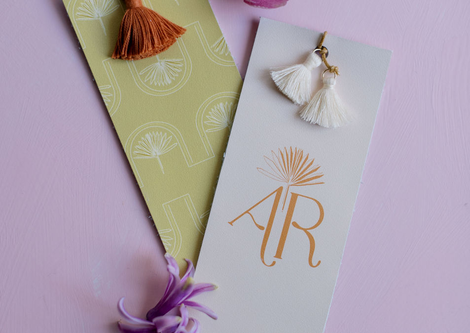 A whimsical suite with letterpress details and playful forms. Printed leather guest tags with colorful tassels, functional menu place-mats, color-blocked namecards, table numbers, and escort display.