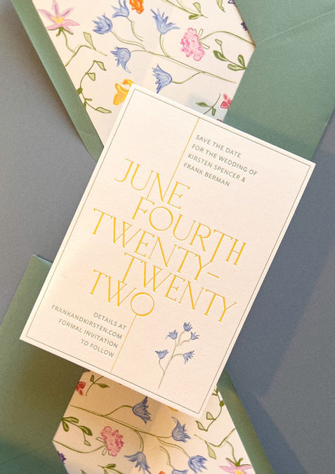 A duplexed invitation design, featuring an archival print of the couple's photograph and letterpress detailing on both sides. Playful floral illustrations and type, reminiscent of the groom's favorite watch face.